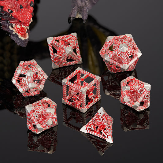 D&D Hollow Dragon Metal Polyhedral Dice Set for RPG and Tabletop Games - 3D Red White