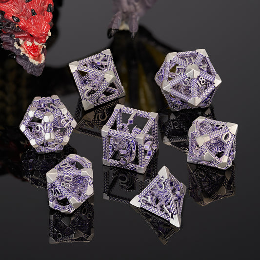 D&D Hollow Dragon Metal Polyhedral Dice Set for RPG and Tabletop Games - 3D Purple White