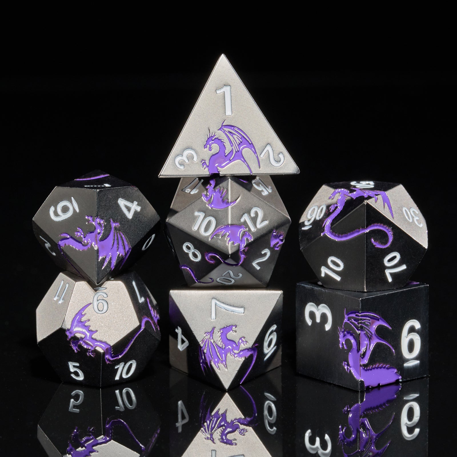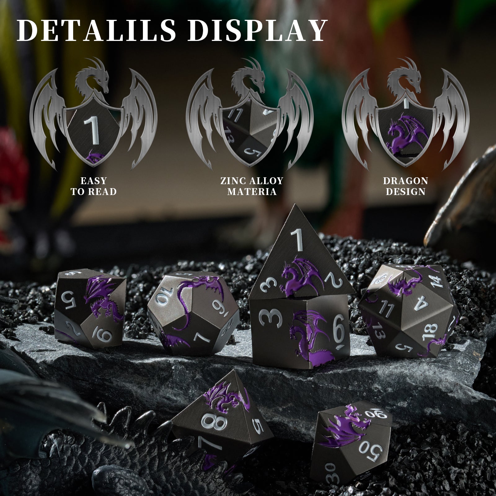 - 【Dungeons and Dragons Gifts Dice】Solid metal dice offer satisfying durability and make an exceptional DND dice. Each die has cool dragon engraving, durable coating superbly crafted dragon dice make them stand out on the gaming table, the whole set of dice is super cool and creates a mysterious atmosphere for dice games.