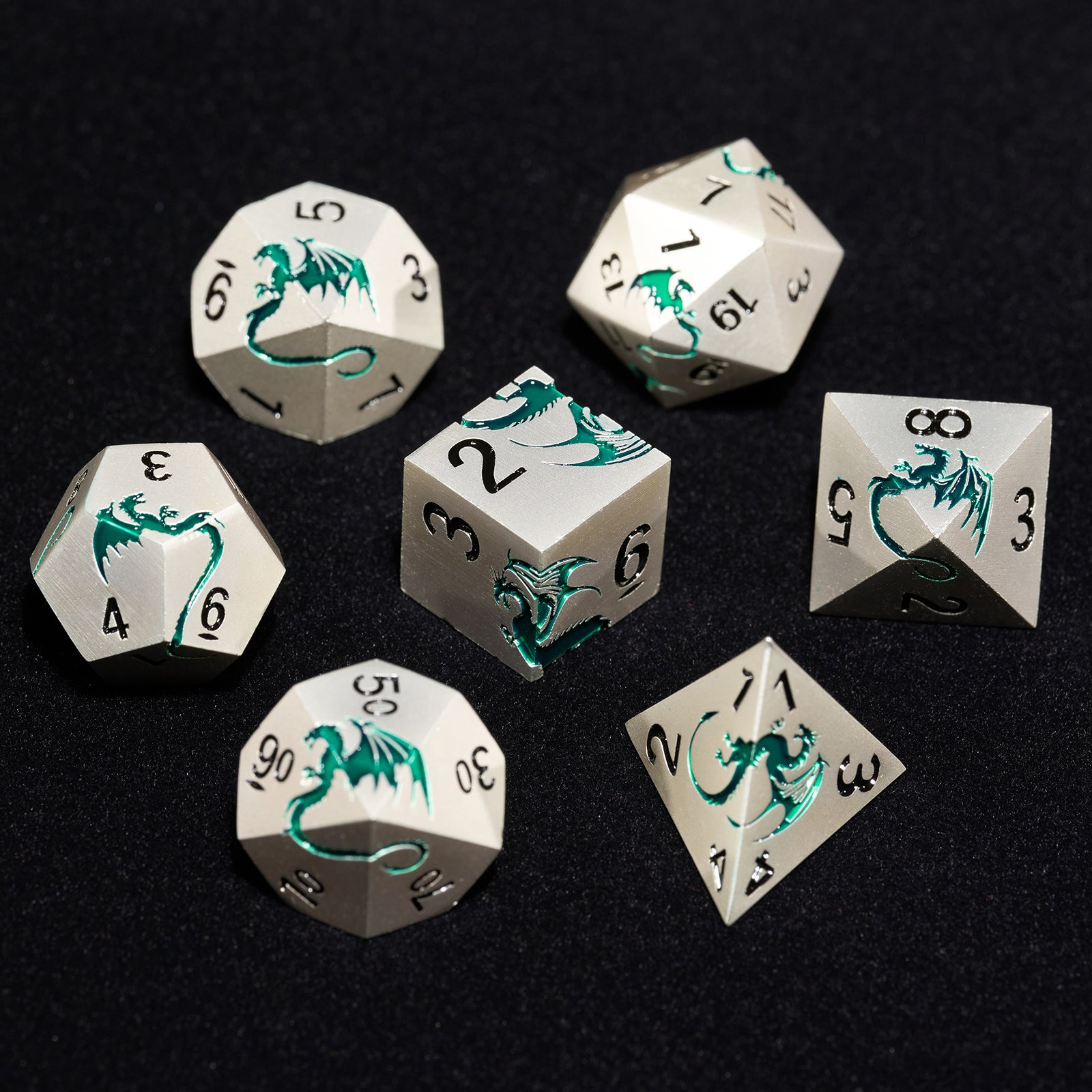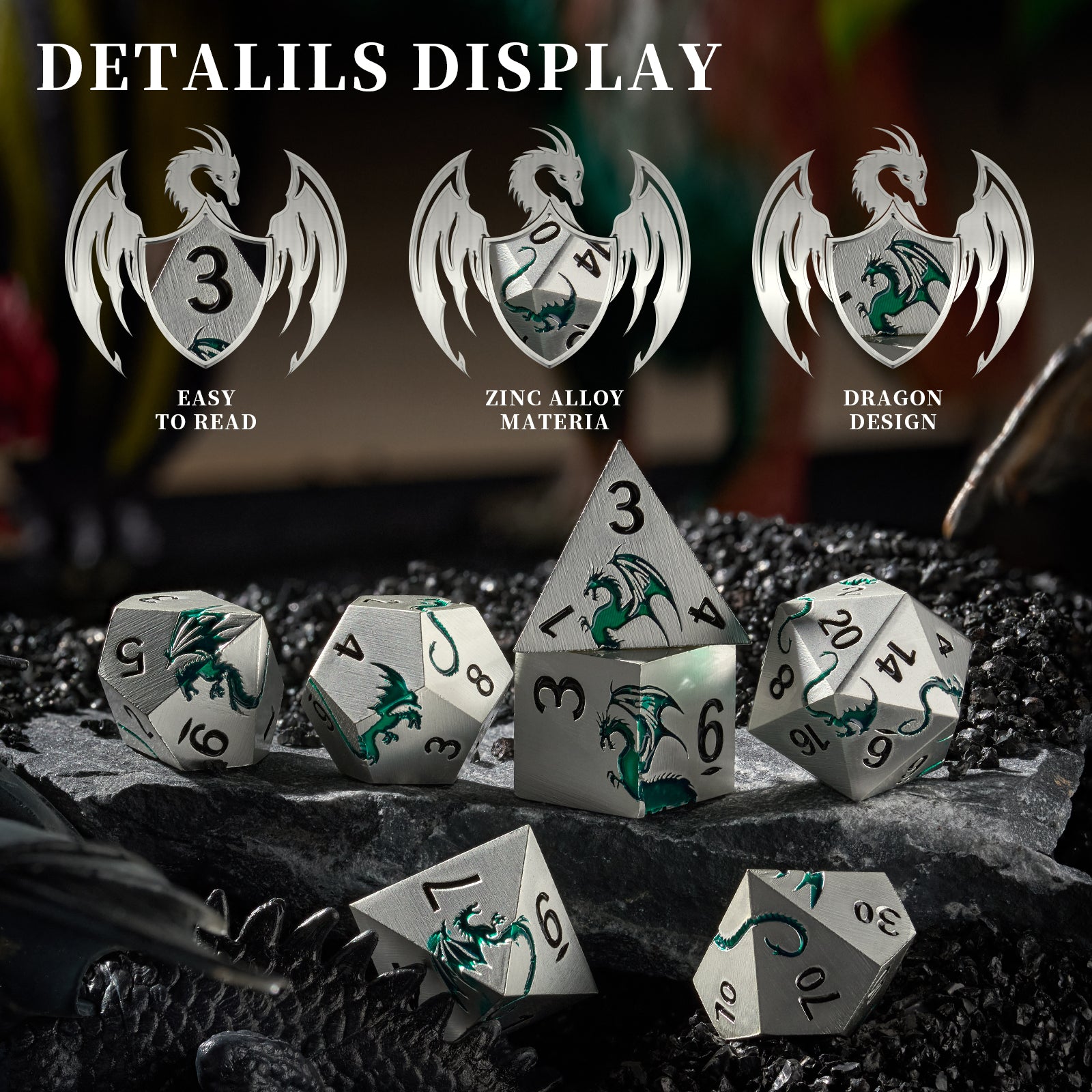 7 PCS Heavy Metallic Dragon D&D Dice Set with Gift Box for DND Tabletop Game(WhiteGreen)