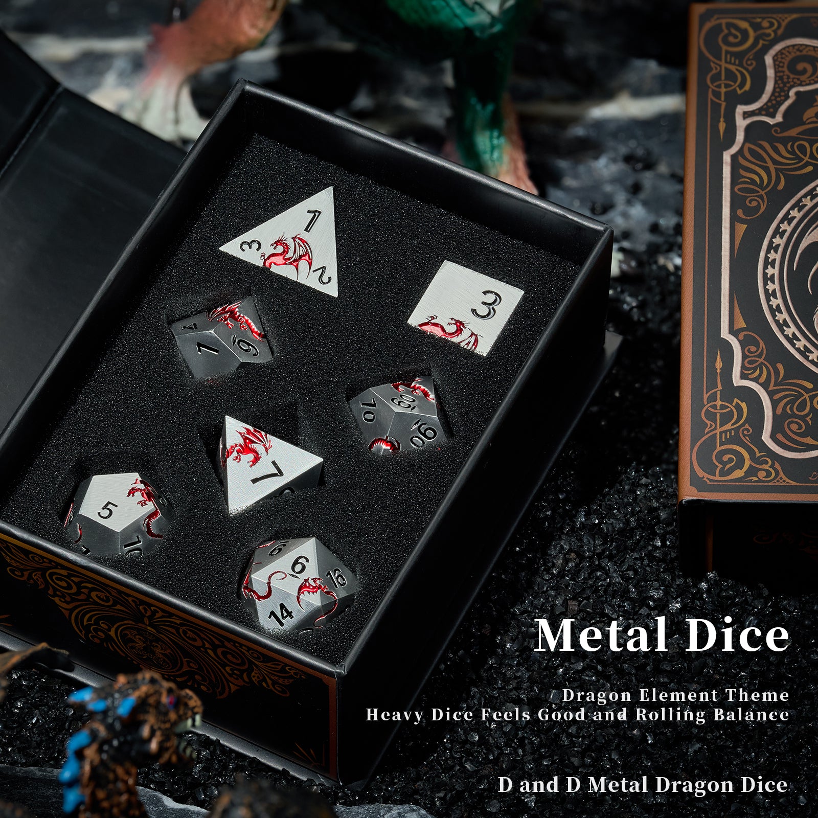 - 【Dungeons and Dragons Gifts Dice】Solid metal dice offer satisfying durability and make an exceptional DND dice. Each die has cool dragon engraving, durable coating superbly crafted dragon dice make them stand out on the gaming table, the whole set of dice is super cool and creates a mysterious atmosphere for dice games.