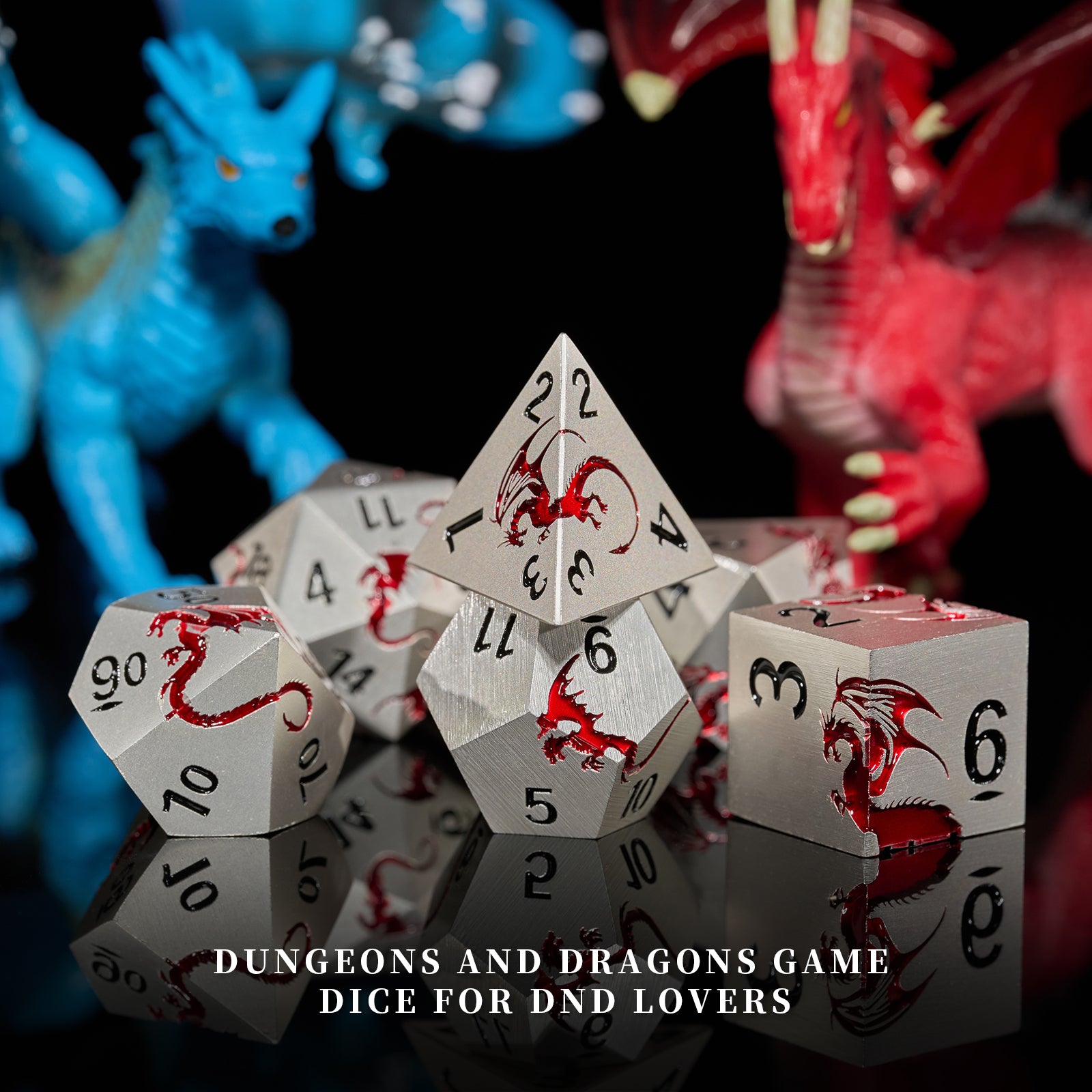 Metal Dice Dragon, 7 PCS Metallic Dungeons and Dragons Dice Set with Gift Case for DND(Matte Silver Red)