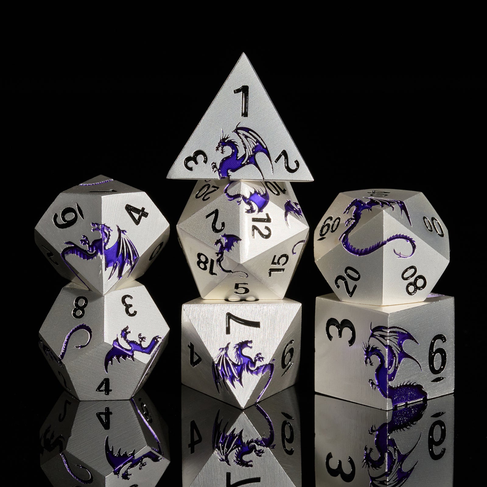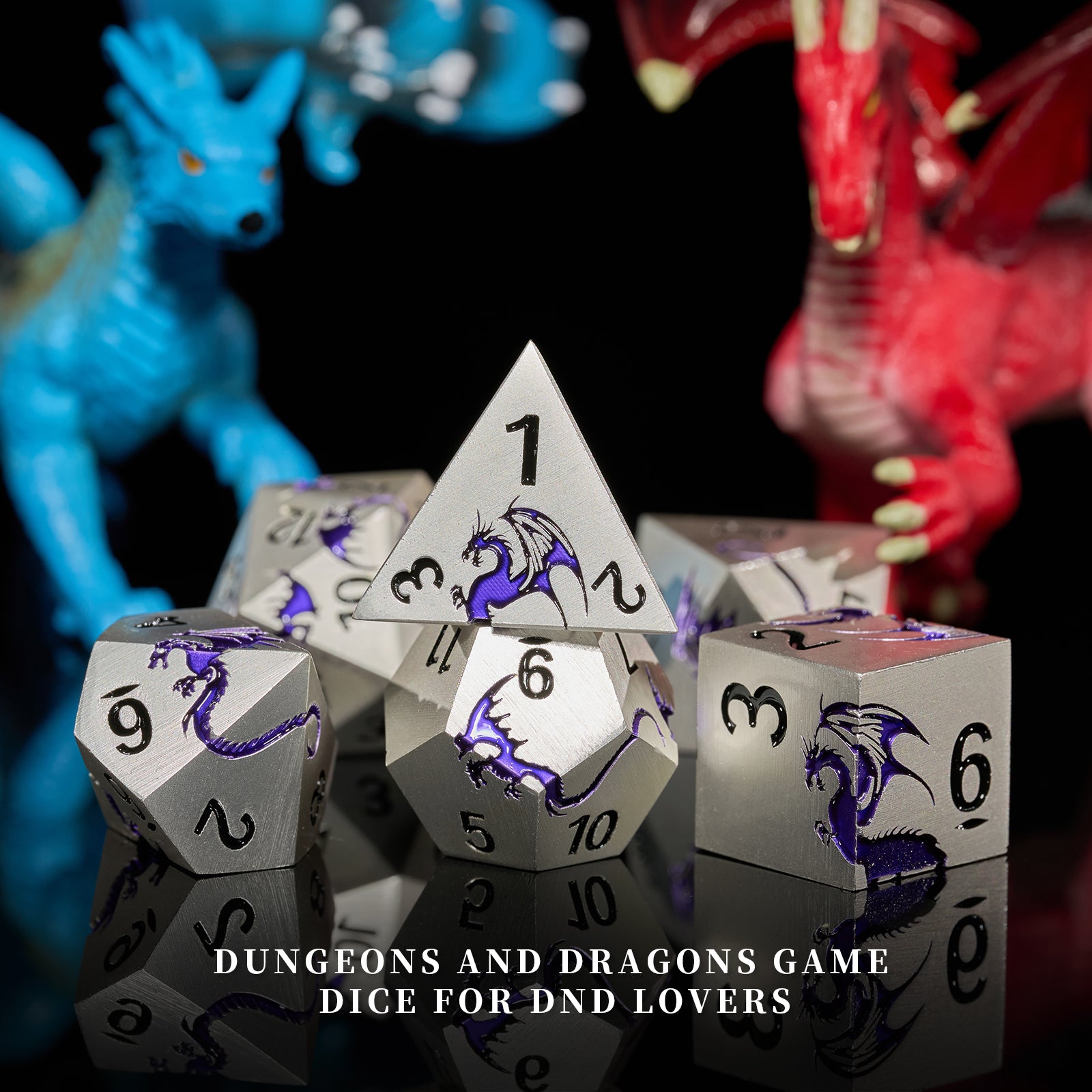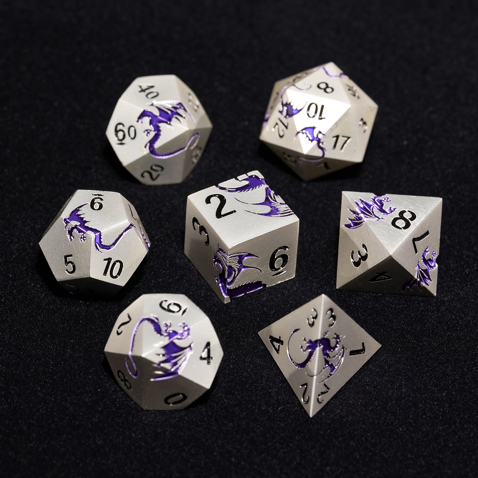 Metal Dice Set D&D 7 PCS Dragon Metallic DND Dice Set(Matte Silver Purple)